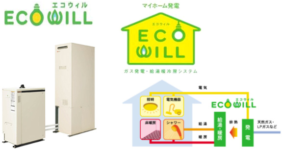 エコウィルは、LPガスで発電し、その際の排熱を利用して給湯や暖房も出来るシステムです。
