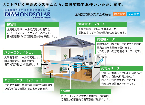 住宅用太陽光システムは、住宅の屋根などに設置した太陽電池で暮らしに必要な電気を発電します。発電した電気が余った場合は、電力会社に売り、電気が不足した場合は、これまで通り電力会社から買うこととなります。 だから電力の安定供給を確保しつつ、発電した電気を無駄なく活用することが出来るシステムなのです。 国と市町村の両方から補助金を受けることが出来ます。 詳しくは、お問い合せ下さい。